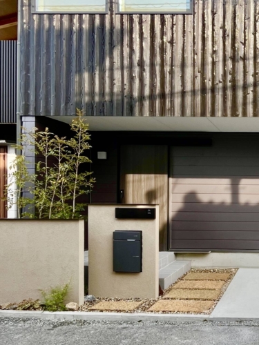 外構工事が進み、植栽された玄関はグッと家らしくなり、